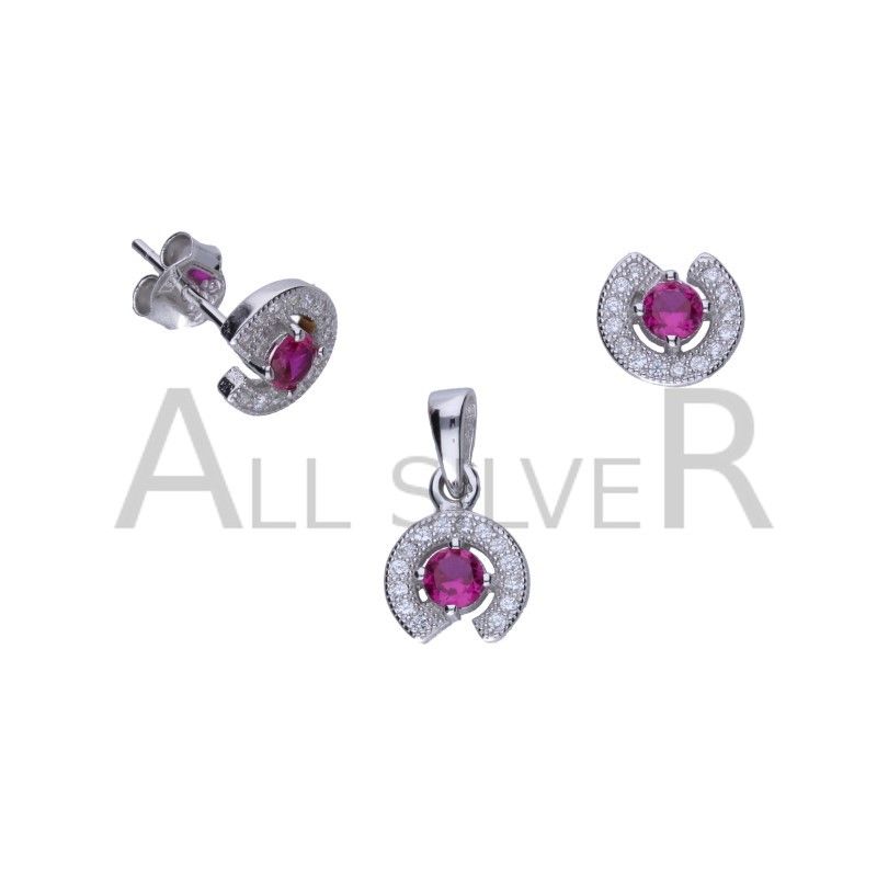 DELICATE SET WITH WHITE ZIRCONS, CENTRAL CUBIC ZIRCONIA IN COLOR DARK PINK, SILVER 925 RHODIUM PLATED.