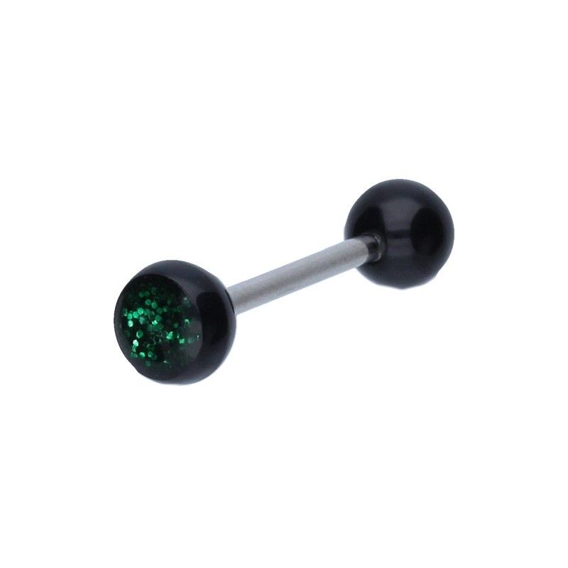 TONGUE EARRING BAR, SURGICAL STEEL, GREEN JEWELERY COMPOUND WITH SUMMER GLITTER, BLACK BALLS 6mm DIAMETER.