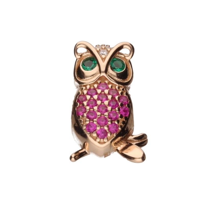 BEAD-TYPE PENDANT FITS MODULAR BRACELETS WITH A MAX DIAMETER OF 3mm, COMBINATION OF 925 SILVER, RHODIUM-PLATED WITH PINK GOLD-PLATED, COLORFUL ZIRCONIA, OWL
