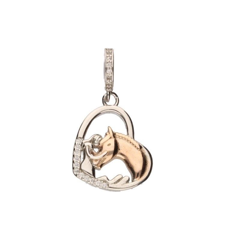 BEAD-TYPE HANGING PENDANT FITS MODULAR BRACELETS WITH A MAX DIAMETER OF 3mm, A COMBINATION OF 925 SILVER RHODIUM-PLATED WITH PINK GOLD-PLATED, WHITE ZIRCONIA, HORSE, HORSE, PONY, GIRL, AMAZON, HEART