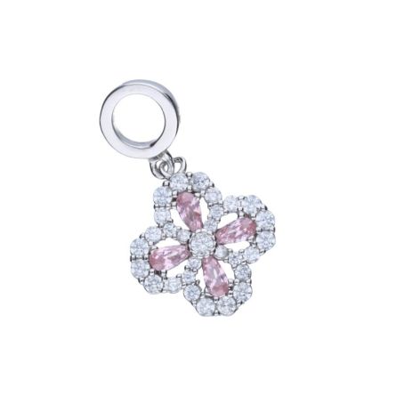 Bead hanging pendant matching modular bracelets with a diameter of max 3mm, silver 925 rhodium, pink and white rhinestones, flower, clover, clover with dimensions 13mm x 13mm.