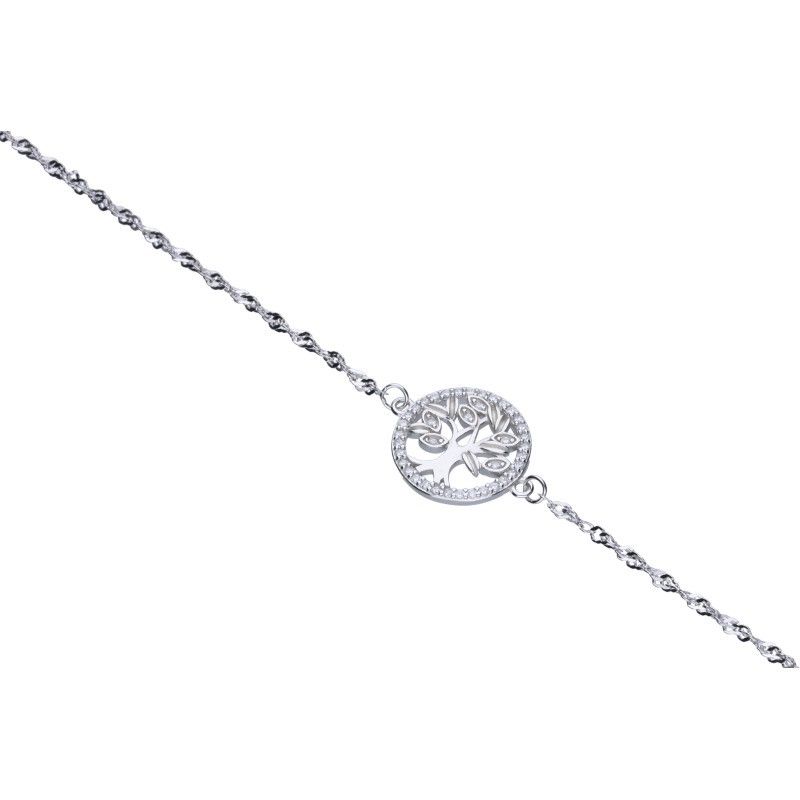 Bracelet on a Singapore weave chain, 925 rhodium silver, length 18cm+2cm extension, white rhinestones, a tree of life, a diameter of a decorative element 15mm.