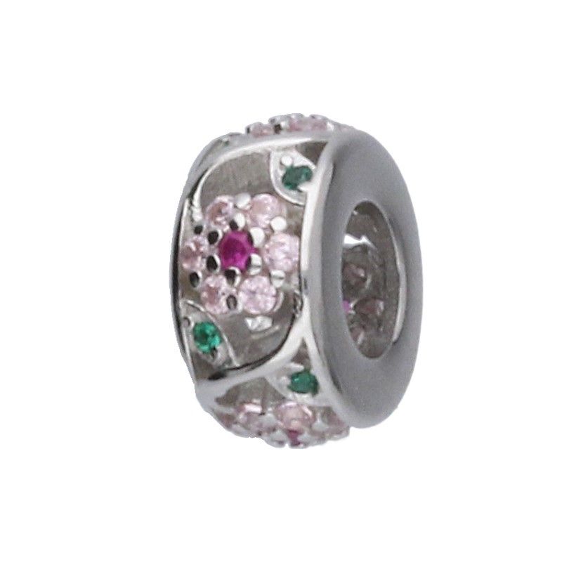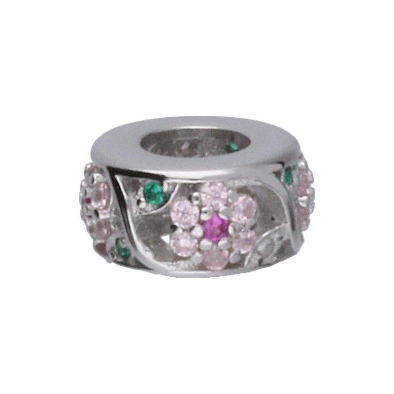Bead openwork pendant matching modular bracelets with a diameter of 3mm, silver 925 rhodium, colorful rhinestones, flowers, flowers, branches, 10mm bead diameter.