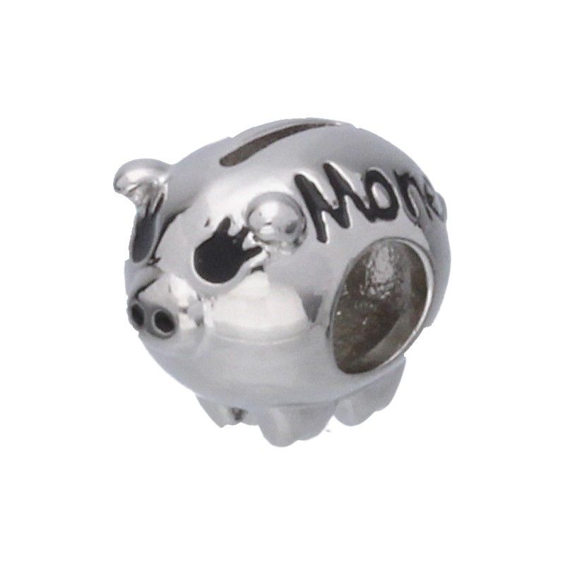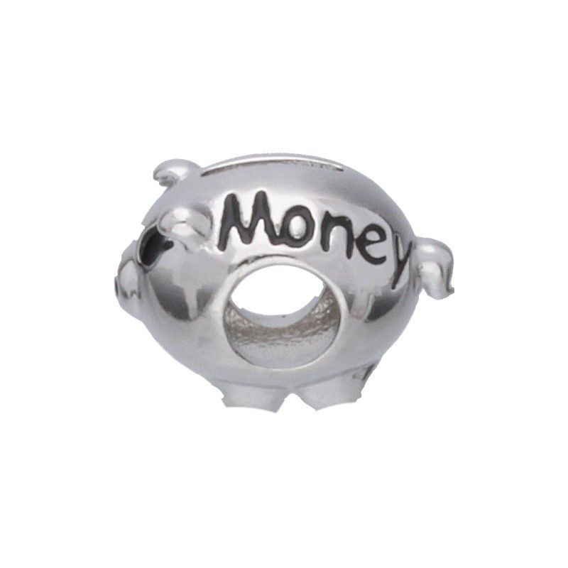 Bead pendant matching modular bracelet with a diameter of max 3mm, 925 Rhodium sample silver, black enamel, pig piggy bank with the inscription Money, dimensions of a bead 11mm x 14mm.