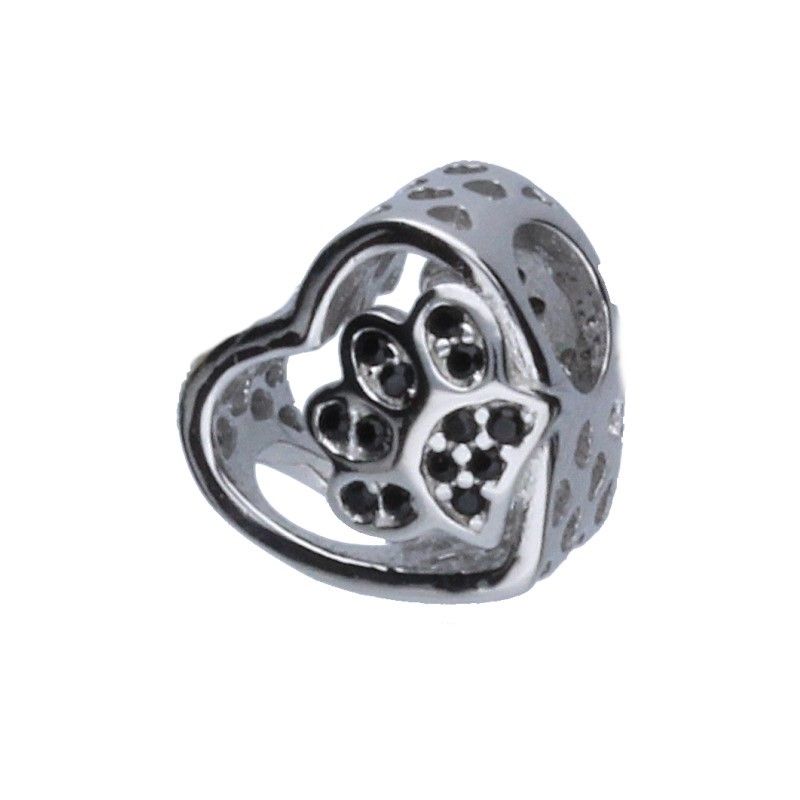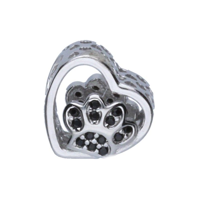 Bead openwork pendant matching modular bracelets with a diameter of max 3mm, silver 925 rhodium, black rhinestones, animal paw, heart, heart, dimensions of the pendant 11mm x 11mm.