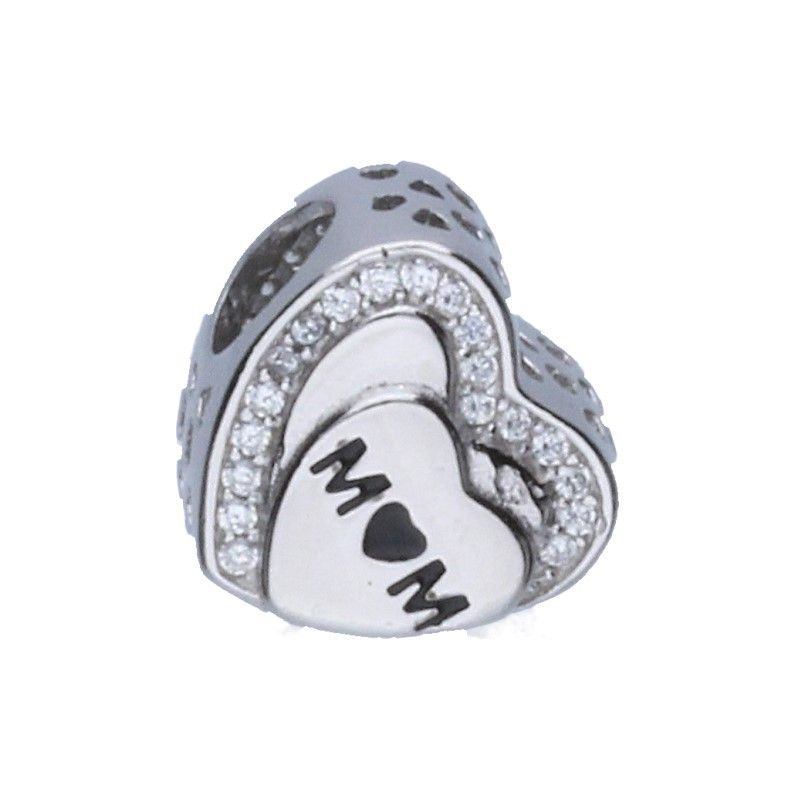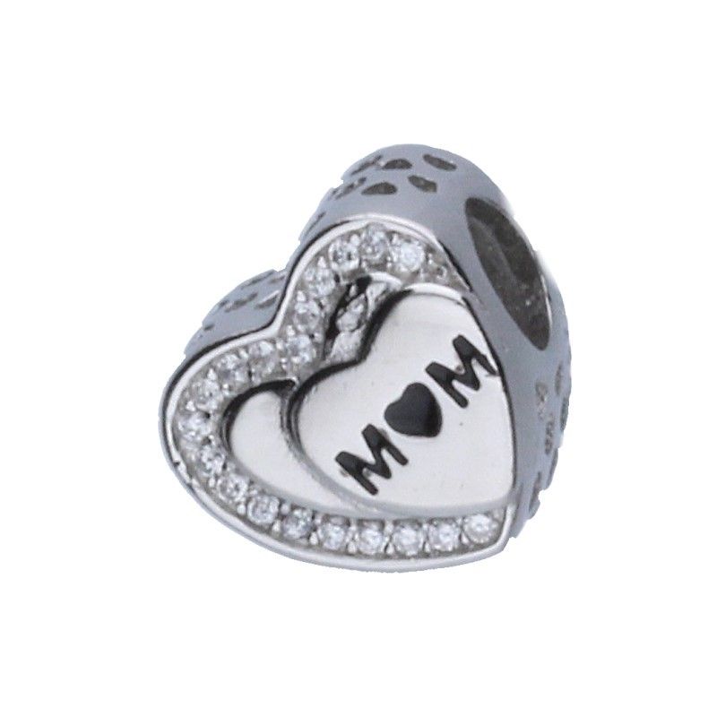 Bead openwork pendant matching modular bracelet with a diameter of max 3mm, silver 925 rhodium, white rhinestones, enamel, heart, heart with the inscription Mom, dimensions of the pendant 11mm x 11mm.