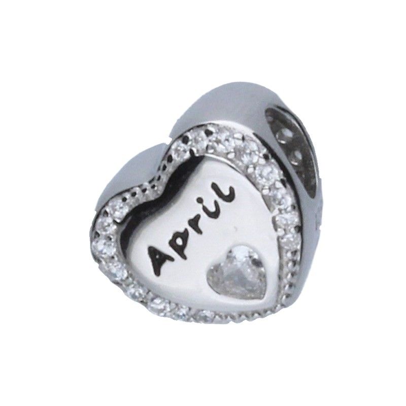 Bead pendant matching modular bracelet with a diameter of max 3mm, silver 925 rhodium, white rhinestones, flower, heart, heart with the inscription April and Strength, dimensions of the pendant 10mm x 11mm.