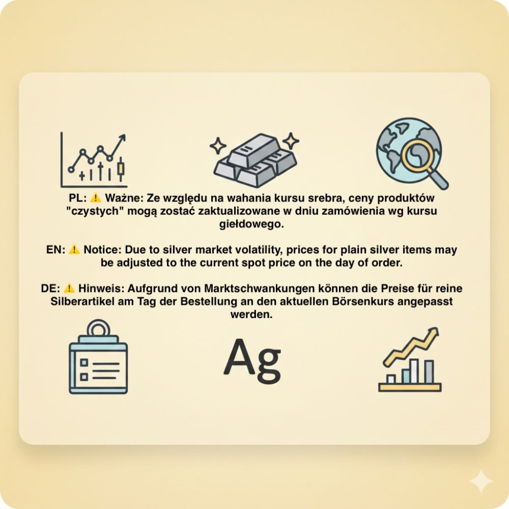 Dear Customers, Due to the high volatility of silver prices on the global market, we are currently unable to update all prices on our platform in real-time. For orders involving plain silver products (without stones) where the listed price is lower than the current market value of the raw material, prices will be adjusted based on the silver spot price on the day of processing.